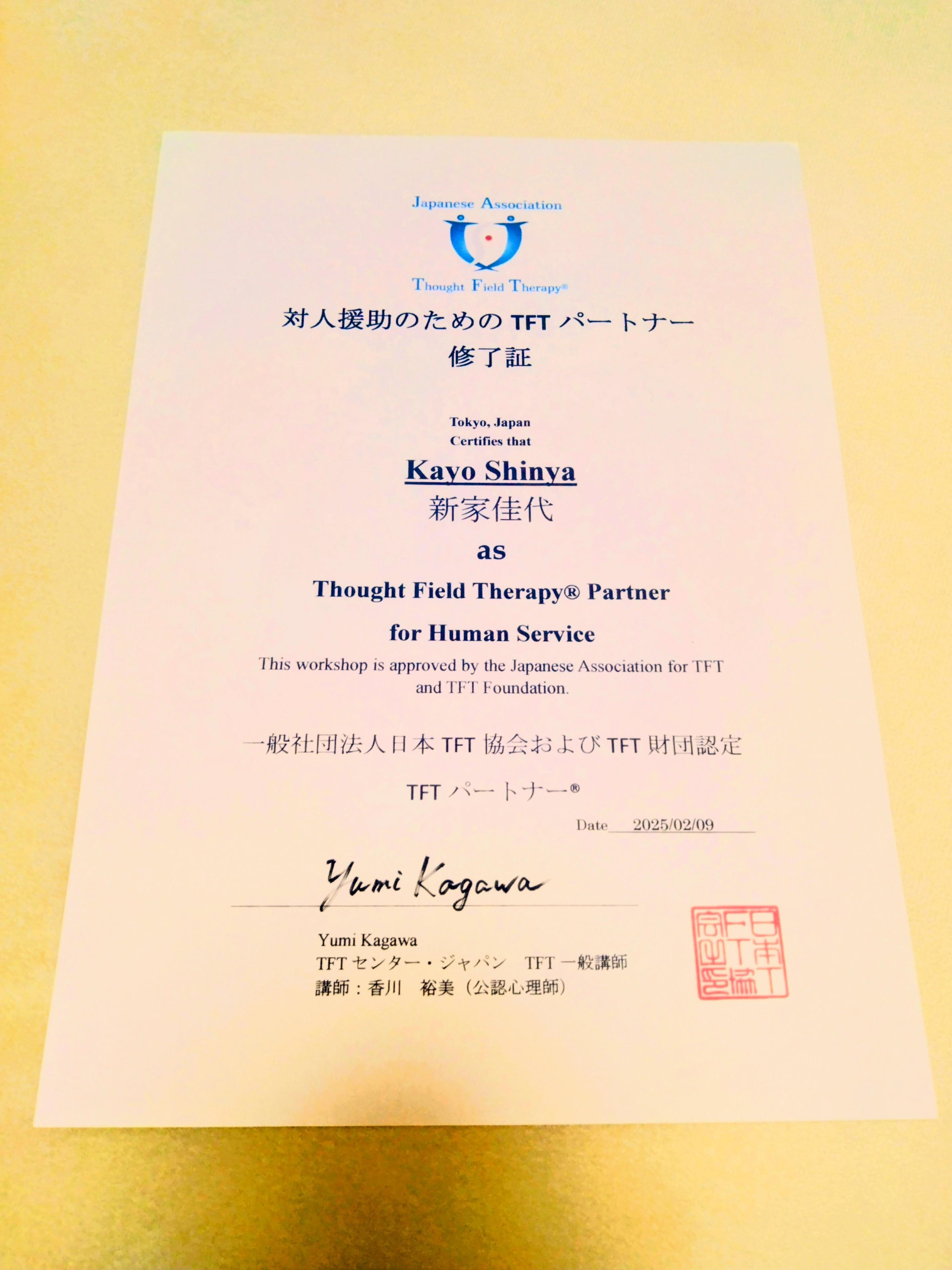 施術者の新家は2025年に一般社団法人日本TFT協会のTFTパートナーです。